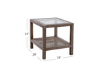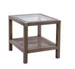 Introducing the Calumn End Table, inspired by coastal farmhouse aesthetics. Crafted from solid wirebrushed rubberwood, it features clear tempered glass inset tops and charming cane inserts in the base. The neutral driftwood finish, complemented by brushed nickel corner cap detailing, brings tranquility to your space.