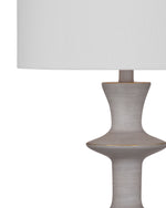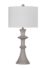 The Candra Table Lamp features a resin base in a light cement finish and a white drum shade.