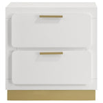 Put the finishing touches on a chic bedroom with a modern two-drawer nightstand. With metallic gold embellishments, it's the perfect solution for nighttime storage. Drawer fronts feature rounded corners for a softened look and feel. Use the top for a reading lamp or personal decor that brings inviting ambiance. Drawers hold up to 44 pounds each, perfect for everything from personal items to books and other accessories.