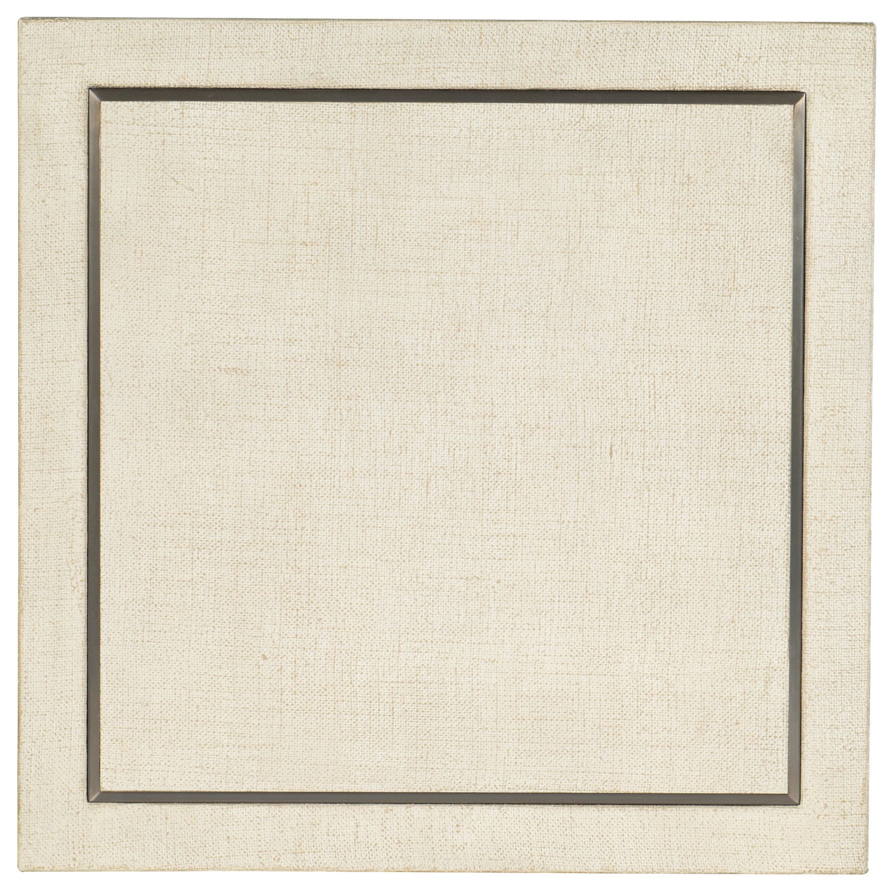 - Finish Description: Pebble Beach: lacquered burlap finish. Champagne colored metal inlay around top and bottom shelf.