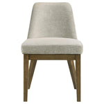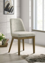 Complete your dining ensemble with this set of two modern side chairs. Offering inviting ambiance to your kitchen or dining room, the pair features a neutral look with a brown oak wood grain finish. Light tan fabric upholstery adds a touch of contrast and airy ambiance. Foam cushions complement with excellent comfort, offering welcoming flair to a comfortable and inviting silhouette. Each chair features a wooden base design with tapering legs for a strong presentation at your dining table.