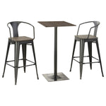 Bring a stylish, industrial vibe to your dining nook or home bar with this chic three-piece bar set. The set features a square bar table with an embossed solid bamboo top in a rich dark elm finish, complemented by a sleek black powder-coated metal base. Paired with two sturdy bar chairs, each with a black frame and matching dark elm-finished bamboo seat, this set provides both comfort and modern flair. The chairs offer ergonomic support with curved backrests and armrests, perfect for enjoying drinks or casual meals. With its durable construction and minimalist design, this bar set is ideal for intimate gatherings and compact spaces, effortlessly blending rustic charm with contemporary elegance.