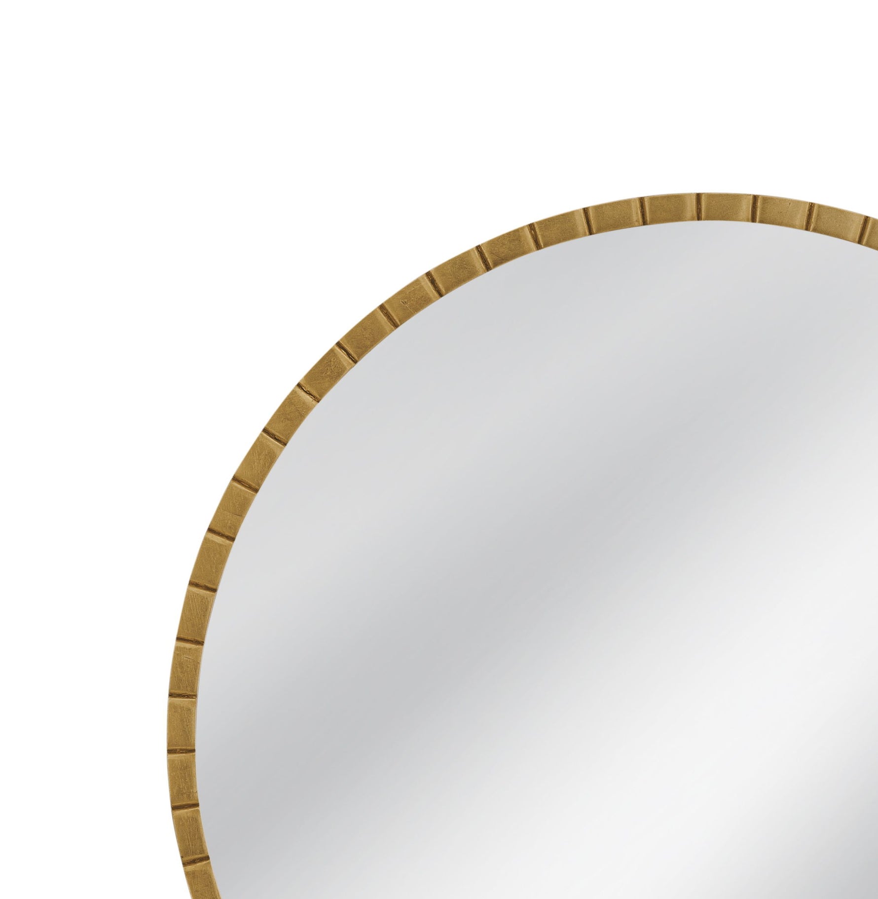 The Celeste Wall Mirror showcases a luxurious gold leaf finish, providing a rich, glam aesthetic that is both luxurious and modern. Its large, round beveled shape creates an expansive reflective surface, making it a statement piece for any room. The gold leaf frame with its subtle texture adds an opulent touch that embodies a sophisticated charm, perfectly suited for spaces designed with a blend of glamour and contemporary style.
