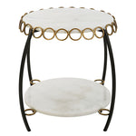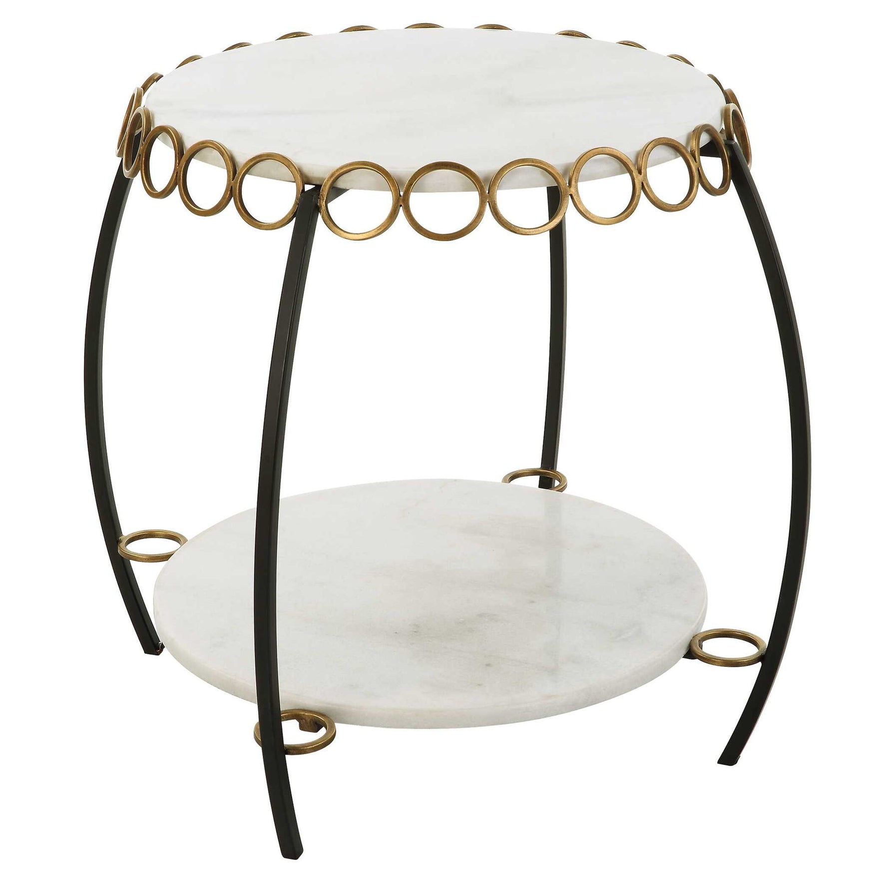 • Shelves Of Honed White Marble Are Decorated With Antique Gold Ringlets With Gracefully Arched Iron Legs In Matte Black. True To The Nature Of Natural Materials, Each Piece Will Have Unique Marbling And Veining Throughout.