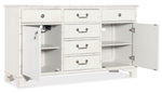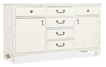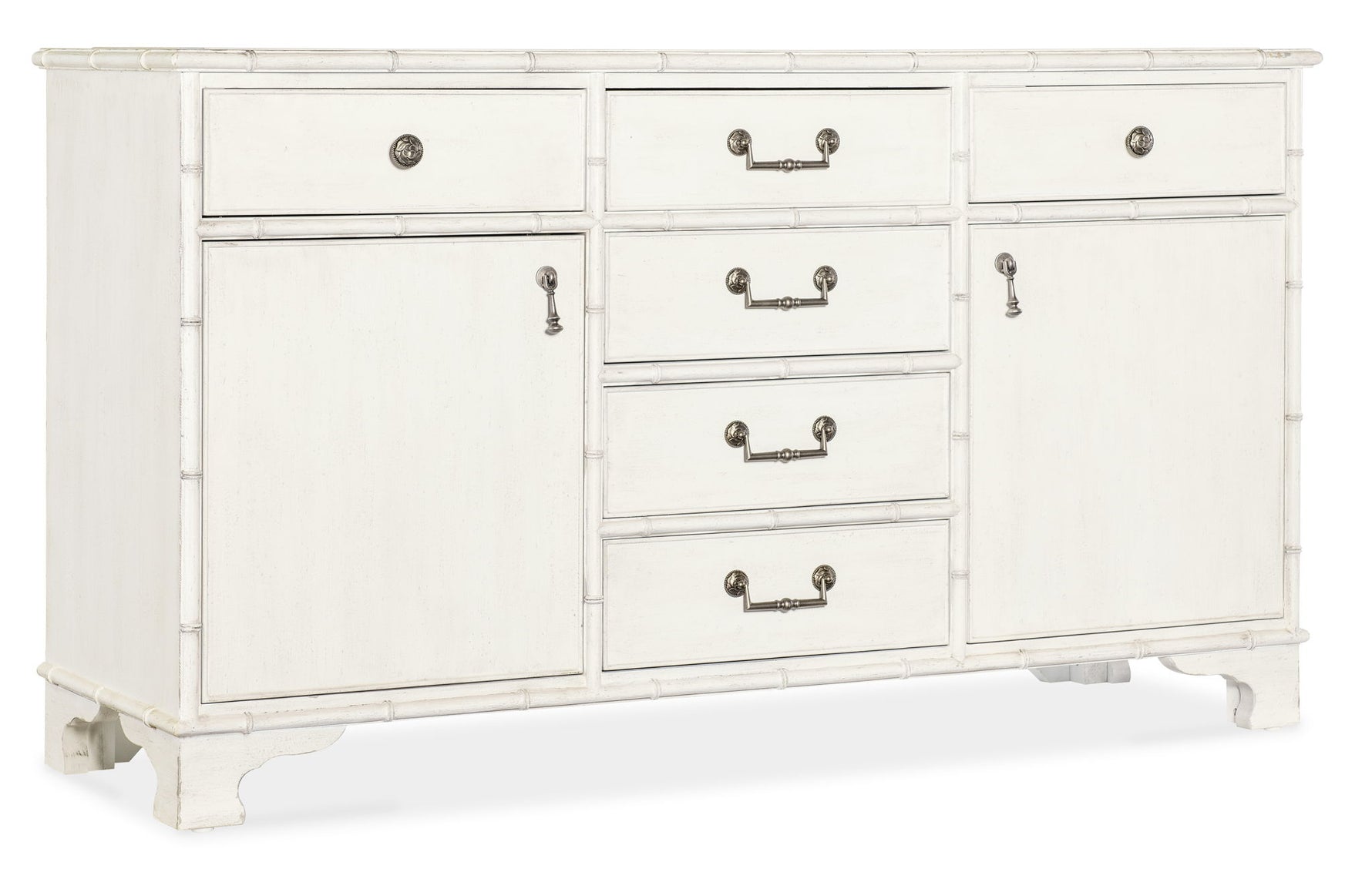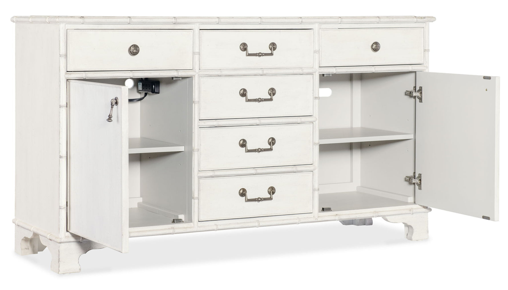 Unit price perCapturing the vintage charm of the coastal South and the tropical craftsmanship of the West Indies, the Charleston Bungalow Buffet is crafted of wood and resin with a Solid Wood Edge top and bamboo-motif accents. It has two doors with soft-close hinges, and six drawers with self-closing drawer guides. The top left drawer has a removable felt liner and the top right drawer has a removable felt silverware tray. There’s one adjustable shelf behind each door and a ventilated back panel. It is finished in White Heron, a softer interpretation of the classic Southern limestone white with a slightly brighter sheen, delivering an heirloom-quality finish.