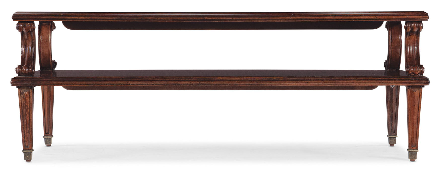 Unit price perWith flair and grace, the two-tiered Charleston Cocktail Table has two generously-scaled surfaces separated by decorative carved wood scrolls in all 4 corners. This distinctive piece has antique bronze metal ferrules on the feet, tapered legs, carved accents and an inlay border on the top. Crafted of Cherry Veneers with Walnut Inlay, it is finished in Maraschino Cherry using natural grain Cherry Veneers showcasing cathedral patterns in the wood.