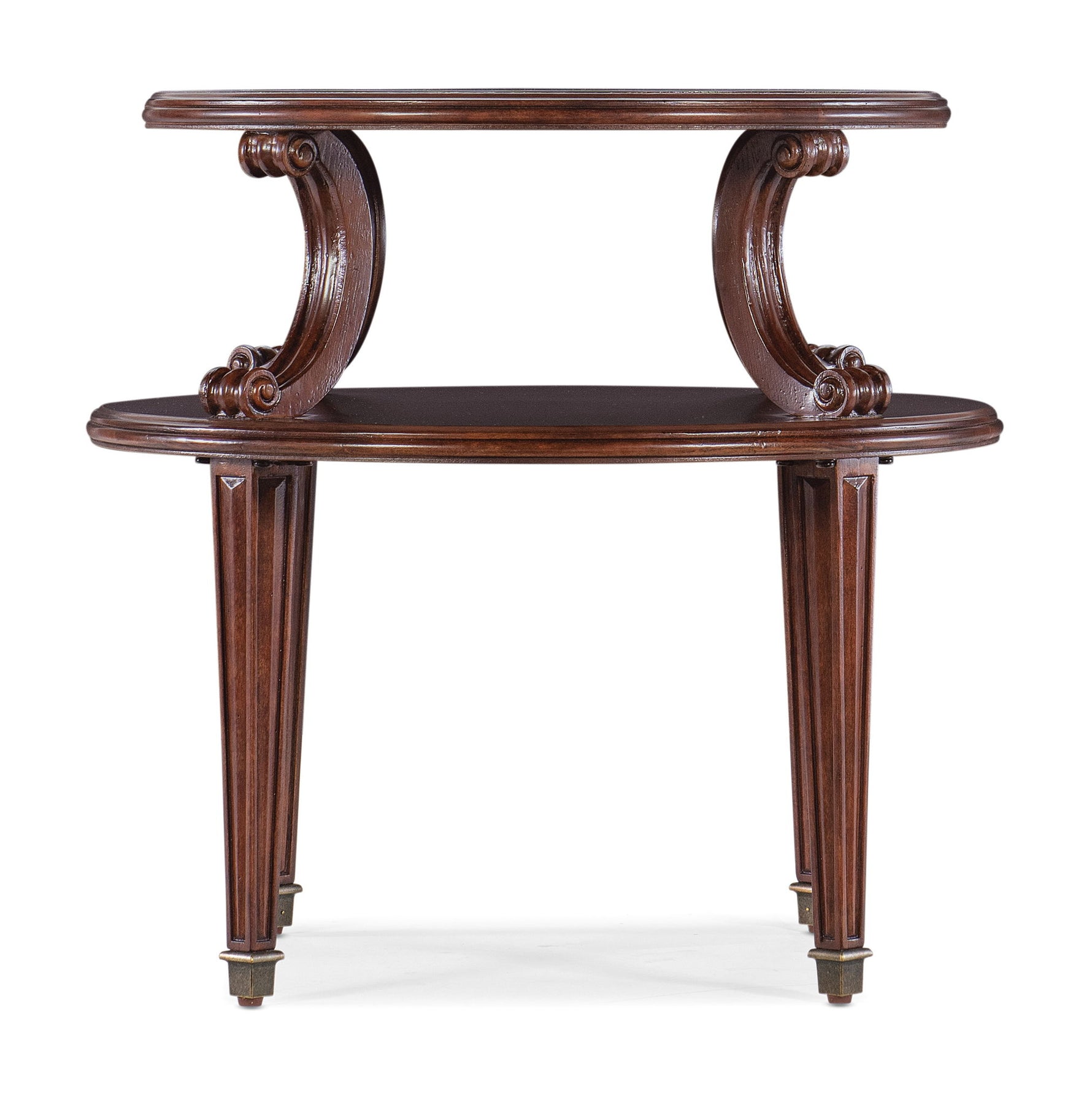 Unit price perWith flair and grace, the two-tiered Charleston Side Table has two surfaces separated by decorative carved wood scrolls in all 4 corners. This distinctive piece has antique bronze metal ferrules on the feet, tapered legs, carved accents and an inlay border on the top. Crafted of Cherry Veneers with Walnut Inlay, it is finished in Maraschino Cherry using natural grain Cherry Veneers showcasing cathedral patterns in the wood.