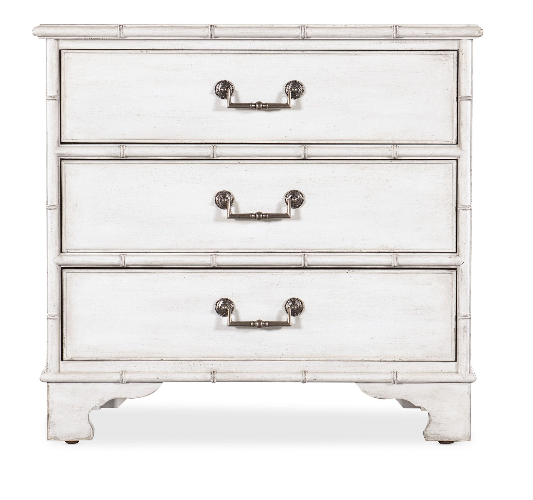 Unit price perInspired by the tropical craftsmanship of the West Indies and the cane accents of the classic British and Dutch Colonial design periods, the Charleston Nightstand has bamboo-motif trim and three drawers with self-closing drawer guides. The wood nightstand is finished in White Heron, a softer interpretation of the classic Southern limestone white with a slightly brighter sheen, delivering an heirloom-quality finish. The drawer interiors are painted gray, and the exteriors have antique pewter-colored decorative bail pulls.