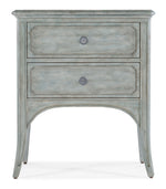 Unit price perCapturing the vintage charm of coastal locales, the Charleston Two-Drawer Accent Table has an arched design between the understated cabriole legs and framed door fronts. Crafted of Hickory Veneers with solid wood tops, the table is finished in Waterscape Blue, a stain and paint combination with a transparent blue-green coloration, allowing you to see into the natural grain of the wood. The decorative bail pulls have an antique pewter finish with white hang up. Two self-closing drawers.