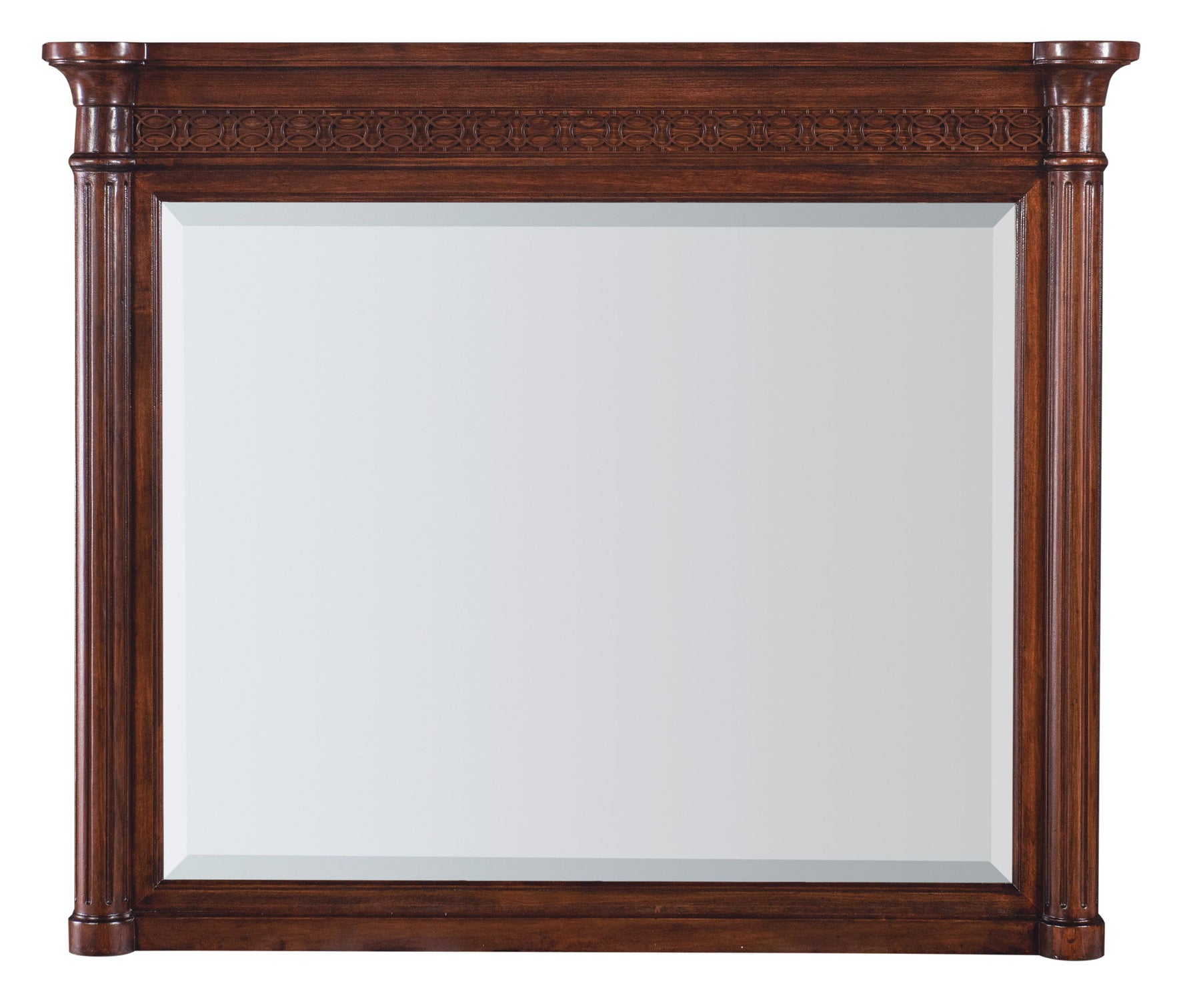The vintage charm of the coastal South meets the traditional soul of the Federal and Georgian design period with the Charleston Beveled-Edge Landscape Mirror. Carved posts and delicate fretwork accents add distinction and allure. Crafted of Cherry Veneers, it is finished in Maraschino Cherry using natural grain veneers showcasing dramatic cathedral patterns and naturally occurring knots in the wood.