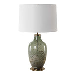 - This Glass Table Lamp Features A Beautiful Blend Of Translucent Olive Green With A Subtle Ivory Wash Paired With Metallic Bronze Flecks, Accented With Plated Antique Brass Finished Details.