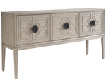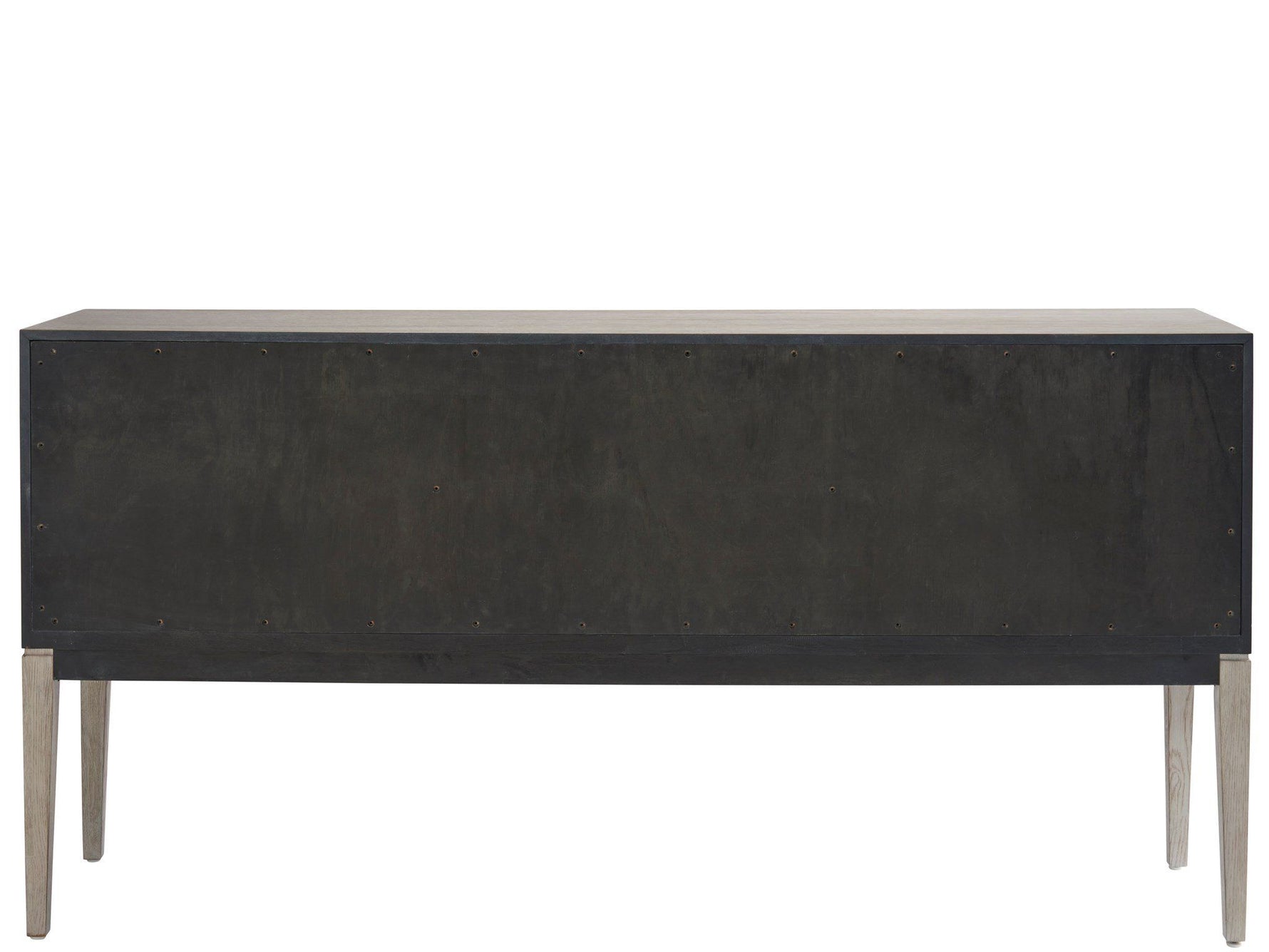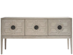 The Madden Sideboard, presented in the tranquil Rolling Fog finish, is a masterclass in craftsmanship, its exterior adorned with meticulous carvings inspired by geometric precision and clean lines, making it an exquisite storage solution that commands attention.