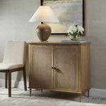 Mid Century Inspired With Accents Of Natural Rattan Cane, This Two Door Cabinet Features Mindi Solids And Veneers Finished In A Soft Oak Stain. The Two Doors Have Metal Hardware Finished In Dark Gunmetal.