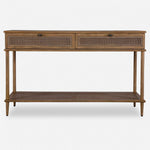 Mid Century Inspired With Accents Of Natural Rattan Cane, This Console Table Features Mindi Solids And Veneers Finished In A Soft Oak Stain. The Coast Table Has One Storage Shelf And Two Drawers With Metal Hardware Finished In Dark Gunmetal.