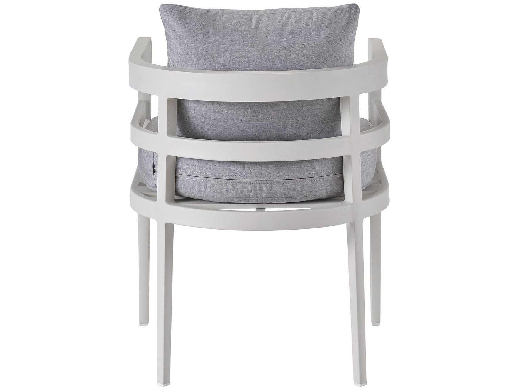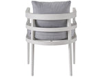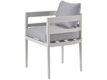 The South Beach Dining Chair introduces a casual elegance to outdoor dining spaces with light gray seat cushions perfectly complemented by a fresh white-hued aluminum body with subtle curvature.
