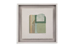 Color Structure I features abstract shapes in pastel greens, blues and peach mounted to simulate floating print in a simple shadowbox frame.