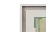 Color Structure IV features abstract shapes in pastel greens, blues and peach mounted to simulate floating print in a simple shadowbox frame.