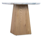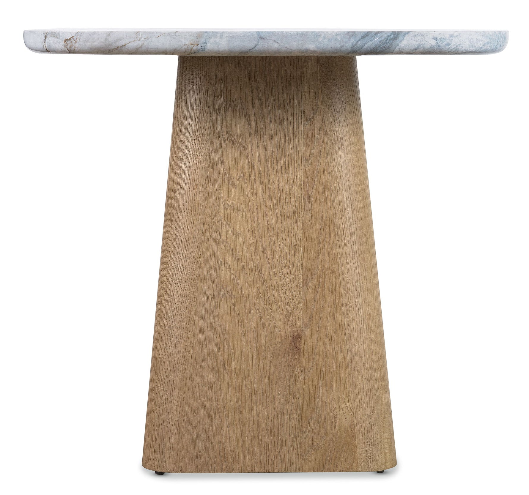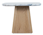 The Hudson Nesting Table offers a combination of natural oak wood and quartz stone. The base is complemented by the quartz stone top, which features natural shades. Its square pedestal design allows it to be used on its own or paired with the low nesting table from the same collection for added versatility and style.