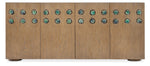 Unit price perWhimsical and organic, the Pilea Entertainment Center is crafted of Oak Solids and Veneers with a light natural finish accented by inset green ceramic pulls in a lily pad design. Measuring 80 inches wide by 18 inches deep, it has four doors with soft-close hinges and touch latches. There’s one adjustable wood shelf behind each left and right door and one adjustable shelf behind the center pair of doors. Features wire management and a ventilated back panel behind all doors.