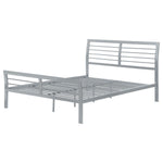This metal bed has a modern allure that's sure to please. It features a high headboard and low footboard built with crisp horizontal bars. It has a simple yet sophisticated appeal in its relaxed, attractive styling. The metal is finished in a handsome silver that's both understated and chic. With its clean lines and casual design, this bed is easily suited to blend with any bedroom decor.