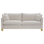 Arched arms, lustrous accents, and elegant tones give this sofa a combination of simplicity and splendor. Includes accent pillows for added style and plush comfort. Reversible down blend cushioned seats sinuous spring deck and webbed back. Stainless steel legs in rose brass. Textured chenille upholstery.