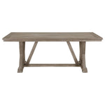 Build an inviting kitchen or dining room with this modern farmhouse dining set at its heart. Designed for casual ambiance, it features a rectangular dining table complete with a trestle base with angular details that are sure to draw the eye. A coastal gray finish complements acacia veneer over acacia wood and MDF, creating a strong, durable set that's built to last. The table is a rectangular design to comfortably seat six, perfect for the family or entertaining friends. Six side chairs add modified ladder backs for depth and texture, with creamy upholstery fabric over foam padded seats for exceptional comfort.