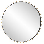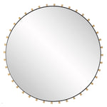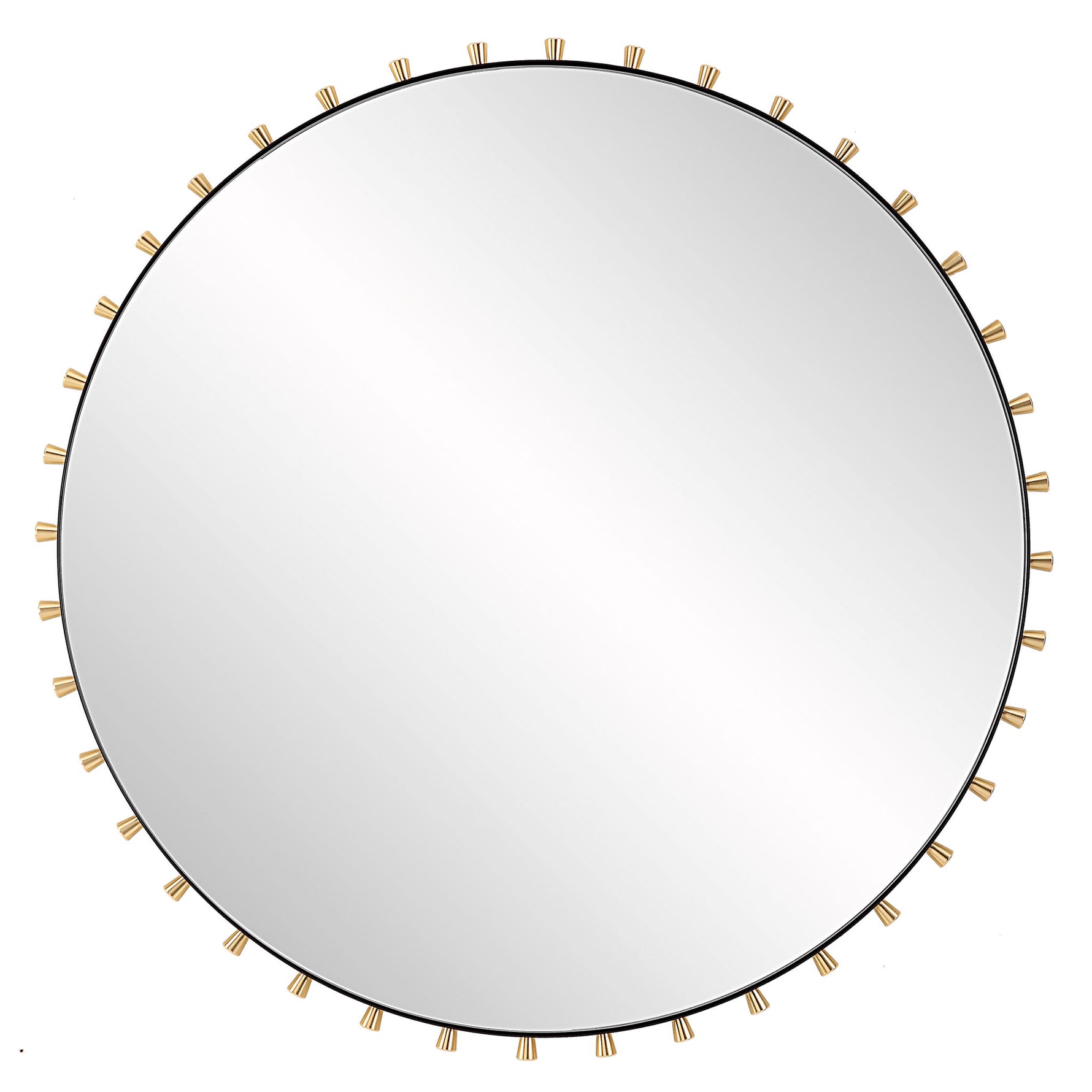 - This Modern Round Mirror Features A Iron Frame Finished In Matte Black, Adorned With Brass Plated Tapered Round Pegs Surrounding A Floating Polished Edged Mirror.