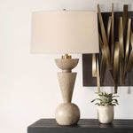 The Cullum Table Lamp Showcases A Geometric Silhouette Crafted From Sand Colored Man-made Stone, Accented With Ant Brass Plated Details. A Slightly Tapered White Linen Round Hardback Shade Completes The Piece.