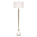 The Curran Floor Lamp Features A Delicately Tapered Metal Body Finished In A Plated Brass And Paired With A Thick White Marble Foot. The Round Hardback Drum Shade Is Covered In A Crisp White Linen Fabric.