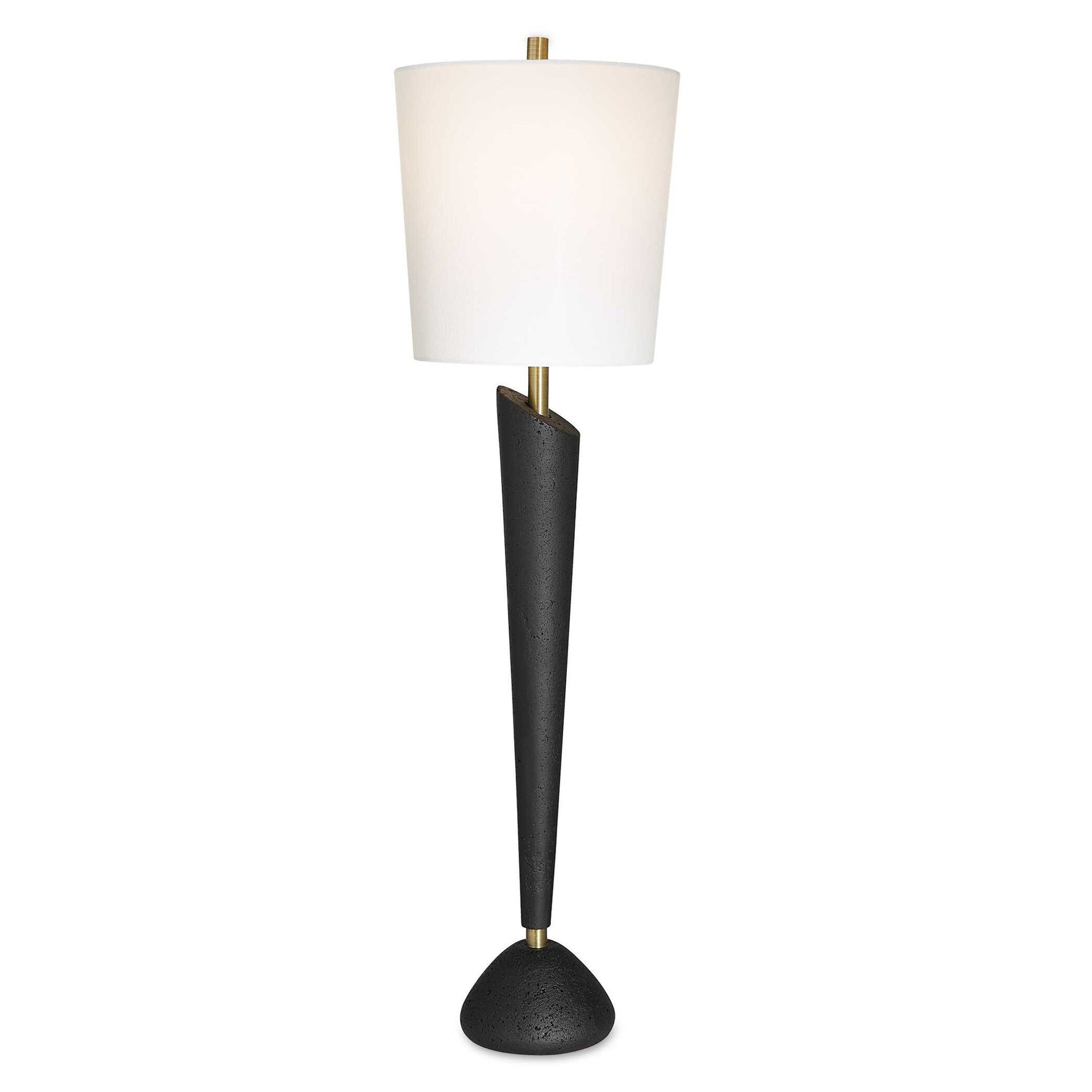 - This Futuristic Buffet Lamp Design Is Made Of Cast Black Man-made Stone With A Noticeable Pitted Surface, Paired With Antique Brass Plated Details. The White Linen Fabric Shade Is Reversed Tapered To Follow The Contour Of The Lamp Base For A Unique Display.