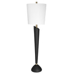 This Futuristic Buffet Lamp Design Is Made Of Cast Black Man-made Stone With A Noticeable Pitted Surface, Paired With Antique Brass Plated Details. The White Linen Fabric Shade Is Reversed Tapered To Follow The Contour Of The Lamp Base For A Unique Display.
