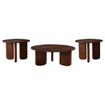 Enhance your living space with this modern coffee table set, featuring a round coffee table and a matching end table. Both pieces are crafted from solid mango wood with a rich brown finish that highlights the natural wood grain. The round tabletops with softly rounded edges offer a sleek yet inviting look, while the distinctive base designs bring depth and visual intrigue. Inwardly angled slab legs with rounded corners provide stability and an artistic touch, creating a cohesive and stylish occasional centerpiece for your home.