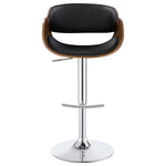 Perfect for a home bar or kitchen island, this barstool is conveniently height adjustable to fit with any space. Beautifully designed, it features a simple, sleek support that flares elegantly into a sturdy, round base. Its seat boasts a cool, curved silhouette with a pleasingly modern feel. The shiny finish of its base creates an appealing contrast to the subdued shades of its seat. With comfortable back and foot rests, it offers maximum support and durability.