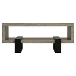 Experience a modern aesthetic with this rectangular coffee table that combines style and functionality. The grey driftwood finish highlights realistic wood grain, creating a rustic yet contemporary look. Crafted from durable engineered wood with a scratch-resistant laminate veneer, it offers long-lasting appeal. The bold black geometric legs provide sturdy support while adding industrial-inspired charm. Its versatile design and lower shelf make it a practical and stylish addition to any living room.