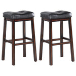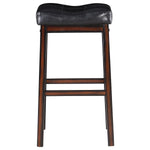 Simple and stylish, this contemporary stool is perfect for a kitchen island or home bar. A curved saddle-style seat offers optimal comfort with plush cushioning. Tufting adds dimensionality to a backless and armless silhouette. Black leatherette upholstery is always stylish, and is easy to care for. Angled legs are crafted in wood and feature a rich cappuccino finish, while built-in footrests offer easy relaxation.