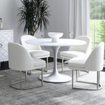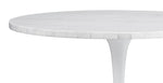 The Dunham Dining Table embodies modern sophistication, featuring a white marble top that boasts elegant gray veining and natural variations. The piece stands on a white matte tulip base, which enhances its clean, fluid lines. Measuring 48 inches, this table comfortably seats four, offering a sophisticated setting for any dining occasion. It's a perfect blend of form and function, designed to complement a range of interior styles with its timeless appeal and graceful presence.