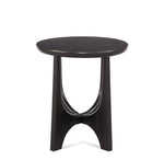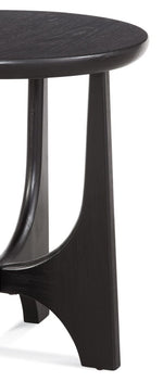 The Dunnigan End Table features modern styling with an organic architectural inspired design. The flat-cut oak wood is finished in a black matte stain. The base design features curving on the inside and straight on the outside for a unique look. Also included are adjustable floor levelers for an even balance.