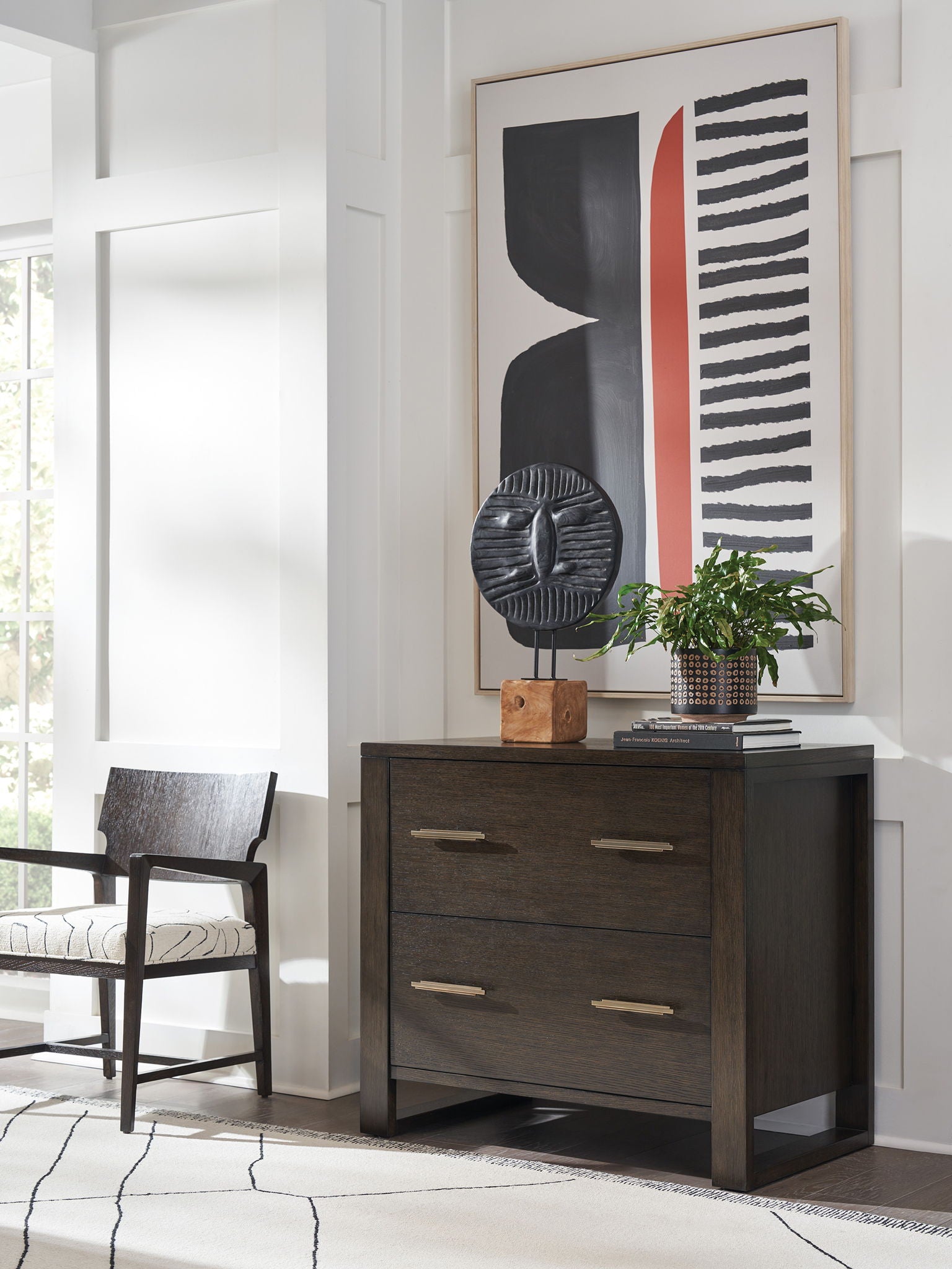 • Two Full-extension Drawers For Legal Or Letter Filing. Open Sled Base Design That Extends Vertically To Frame The End Panels. The Linear Drawer Pulls Are Custom Designed And Finished In A Champagne Finish, Complementing The Dark Walnut Finish On Quartered Oak Veneers.