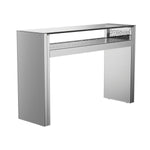 Add instant glamour with this LED console table featuring mirrored panels, a floating tempered glass top, and shimmering faux crystals. The clean, geometric silhouette offers a contemporary touch, while the silver finish brightens any room. Perfect for entryways or living rooms, this striking piece doubles as functional décor with its built-in lighting and sculptural elegance.