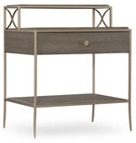 - Finish Description: A soft gray accent finish applied to lightly sand-blasted walnut veneer for an organic and textured look. Champagne silver finish on the metal elements and hardware. Custom-designed knob hardware in a champagne silver finish. Distressing includes wire brushing on wood surfaces and texturing on metal.