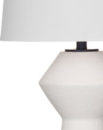 The Ella Table Lamp stands out with its contemporary style, featuring a matte white lamp body with a geometric silhouette that tapers and flares in a striking hourglass shape. This modern design is balanced by the softness of a classic white drum shade, creating a harmonious blend of form and function. The matte finish of the lamp's body ensures that it provides a subtle statement in any space, embodying a sleek and sophisticated aesthetic.