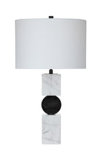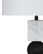The Ellendale Table Lamp features a sleek white marble base with a striking round black marble focal point, creating a bold contrast that enhances its contemporary design. The white drum shade softens the light, adding a warm and inviting glow to any room. This lamp blends modern elegance with natural materials, making it a versatile addition to various interior styles. The Ellendale Table Lamp offers both style and functionality, bringing a sophisticated touch to your home decor.
