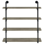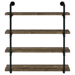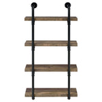 Industrial design can be elegant, as shown by this wall shelf. Plumbing pipe frame highlights the rugged utility that's the hallmark of the style. Wall hanging adds a unique element to the piece. Incorporates four (4) open shelves for ease of storage or display. Available in a variety of finishes and widths for your specific style and space needs.