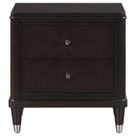 Accentuate bedroom decor with the chic look and impressive functionality of a modern two-drawer nightstand. Its sleek look is accentuated with delicate trim and petite round knobs on each drawer. A dark brown finish ensures a versatile palette, complementing in a variety of bedroom settings to create a warm, soothing ambiance. The top drawer includes felt lining and the bottom drawer cedar, adding protection to your bedside storage. Tapering feet complete the look with metallic finish caps, offering a touch of contrast and depth at your bedside.