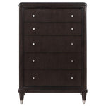 Gleaming knobs and foot caps add contrast and character to a modern five-drawer chest. Its deep brown finish is sleek and refined, perfect for a stylish bedroom with sophisticated presence. Its five drawers offer abundant storage. The top drawer includes felt lining and the bottom drawer is lined in cedar for additional protection for delicate items like jewelry and seasonal sweaters. The top of the chest is perfect for decor, offering a spot for a personal touch in your bedroom.