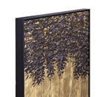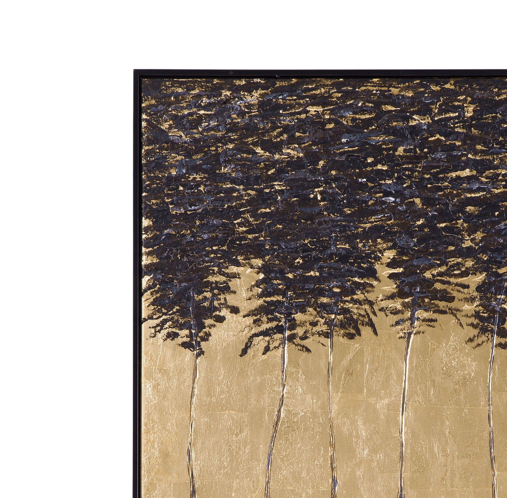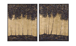 The Enchanted 2 Piece Set canvas art consists of two complementary hand-painted canvases, each depicting a serene, abstract forest scene with tall, slender trees set against a golden backdrop. The artwork is framed in simple black, which accentuates the contrast and adds a modern edge to the pieces. This set offers a touch of nature-inspired allure to any room, creating a focal point that is both mystical and grounding.