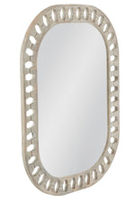 The Enya Wall Mirror offers a modern coastal vibe with its white wash finish and charming cutout patterned frame. Its rectangular shape with rounded corners adds a contemporary touch to any space. A stylish addition that effortlessly complements coastal-inspired decor.