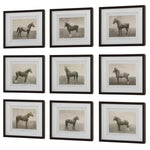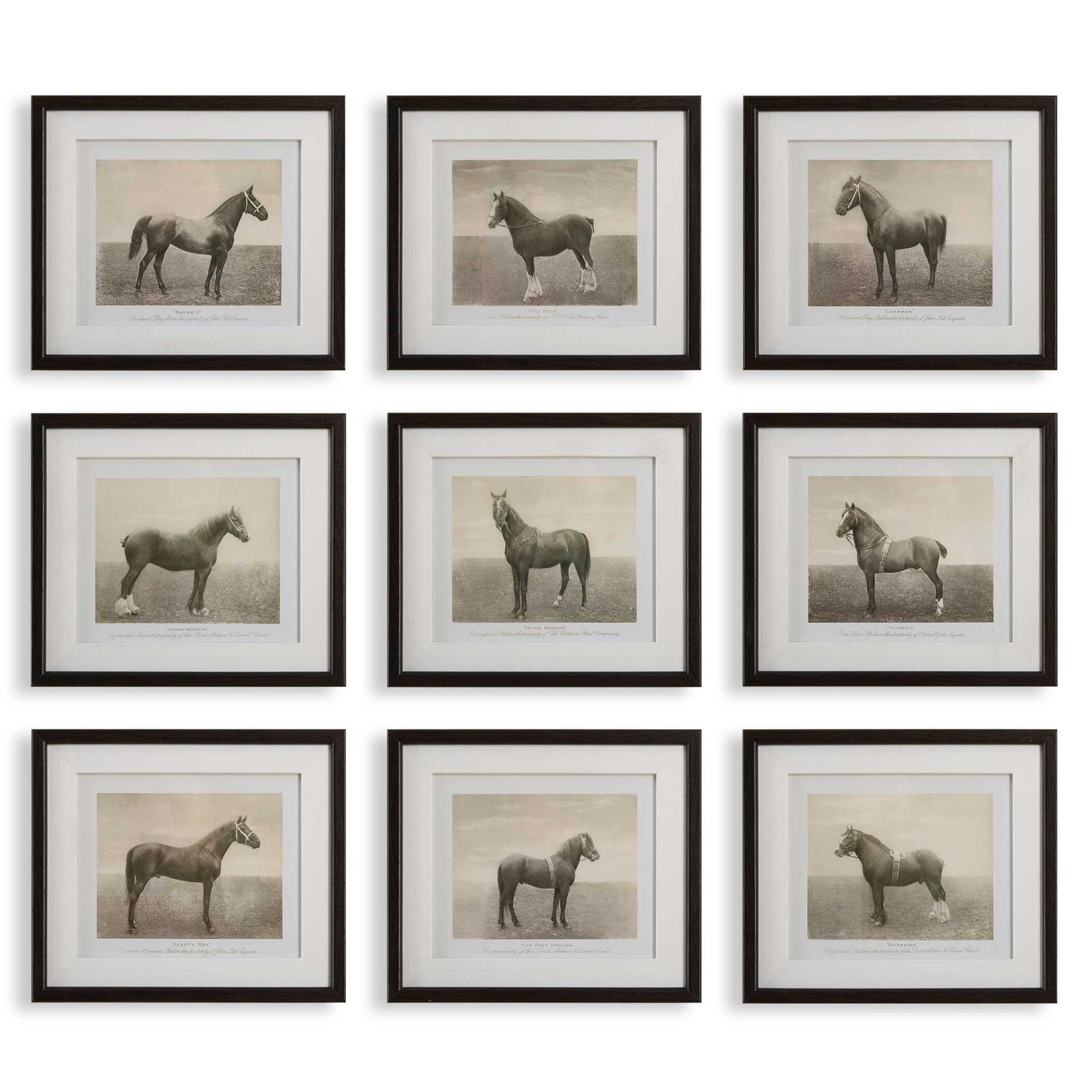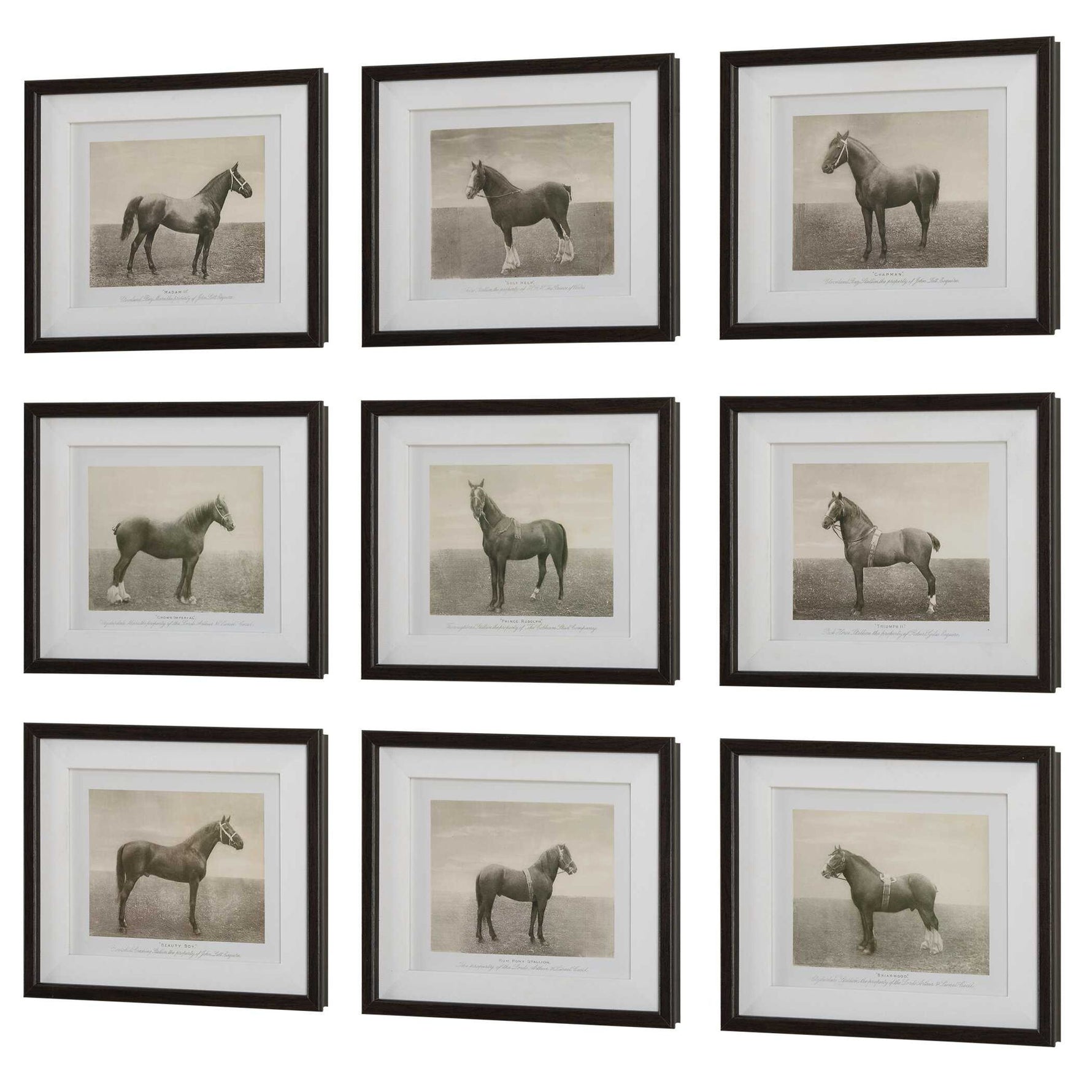 This Regal Set Showcases Nine Antiqued Sketches Of Horses Belonging To Dignitaries And Elite Members Of Society. Surrounded By A Beveled Wood Grain Frame In A Walnut Finish And A Crisp White Linen Liner. Each Print Is Placed Under Protective Glass.