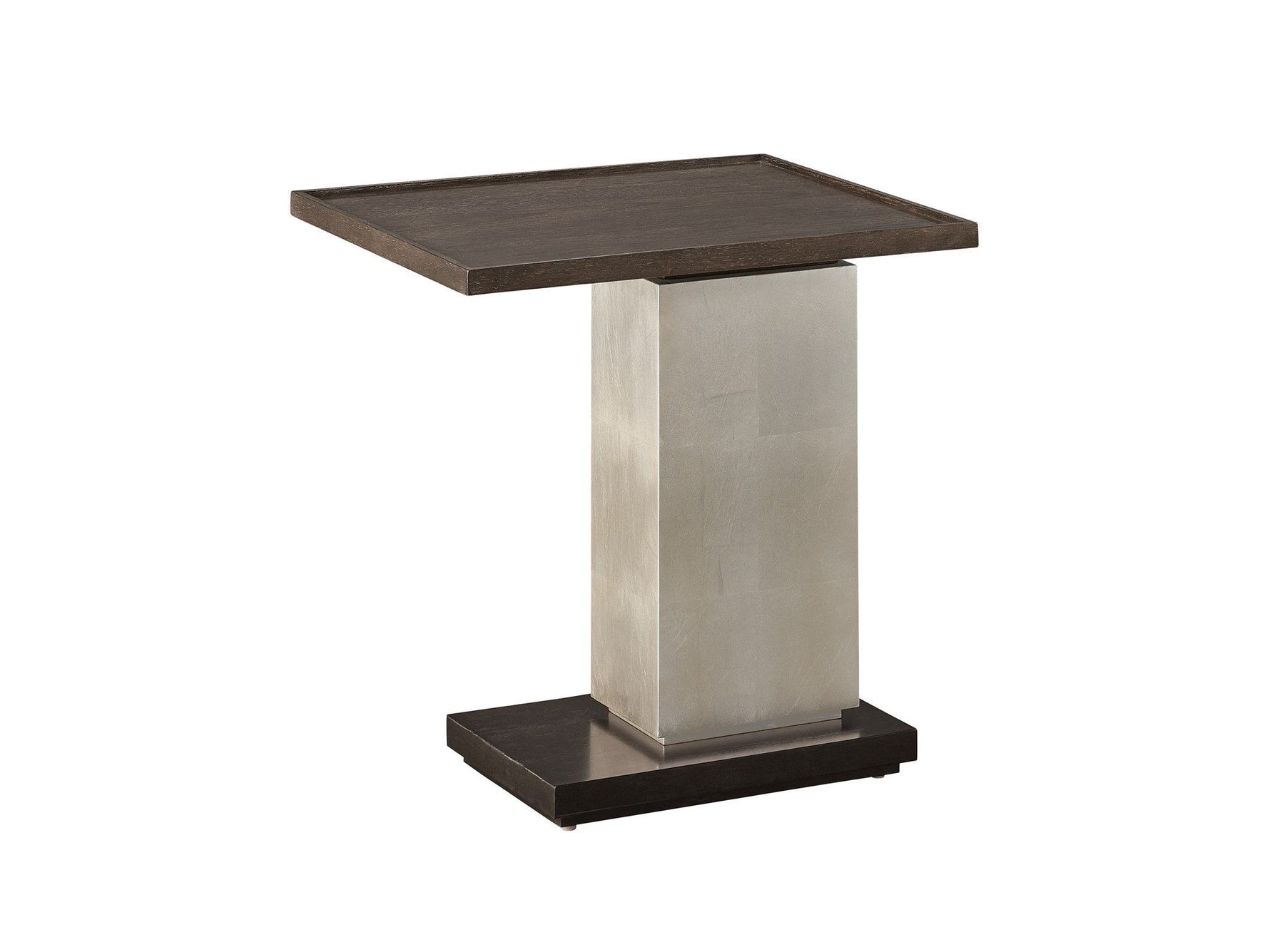 A shimmering silver leaf pedestal connects a dark walnut base to a light walnut top in this intriguing abstract side table.