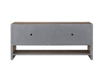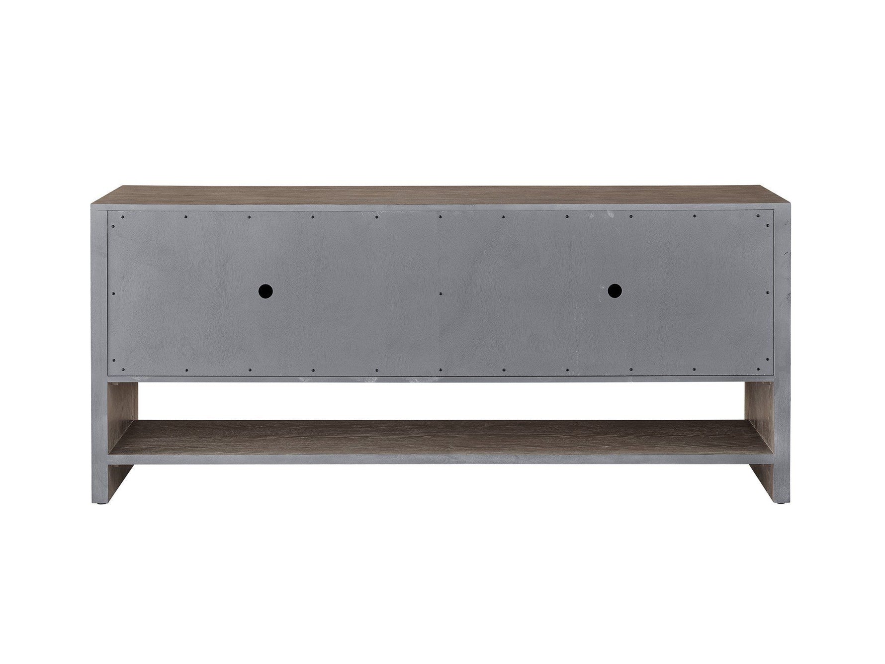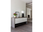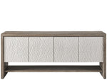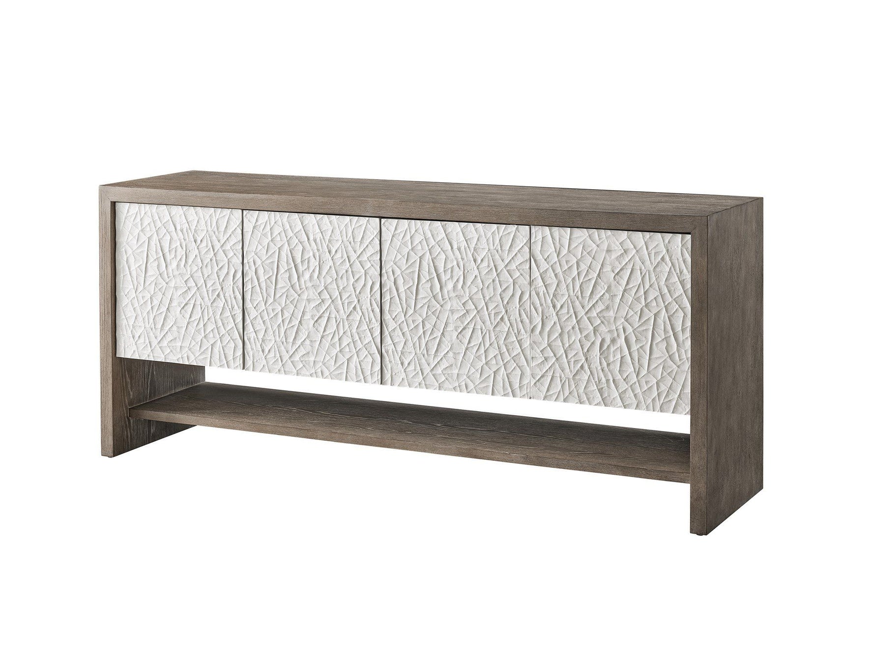 Adjustable shelves behind geometric-patterned doors offer ultimate storage flexibility.